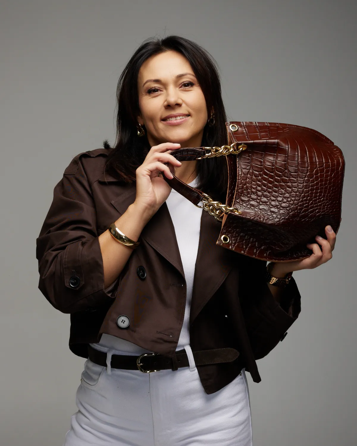 Luksusowa listonoszka NESCA z naturalnej skóry z tłoczeniem croco w głębokim brązie. Minimalistyczna wersja bez widocznego logo, idealna dla miłośniczek subtelnej elegancji.