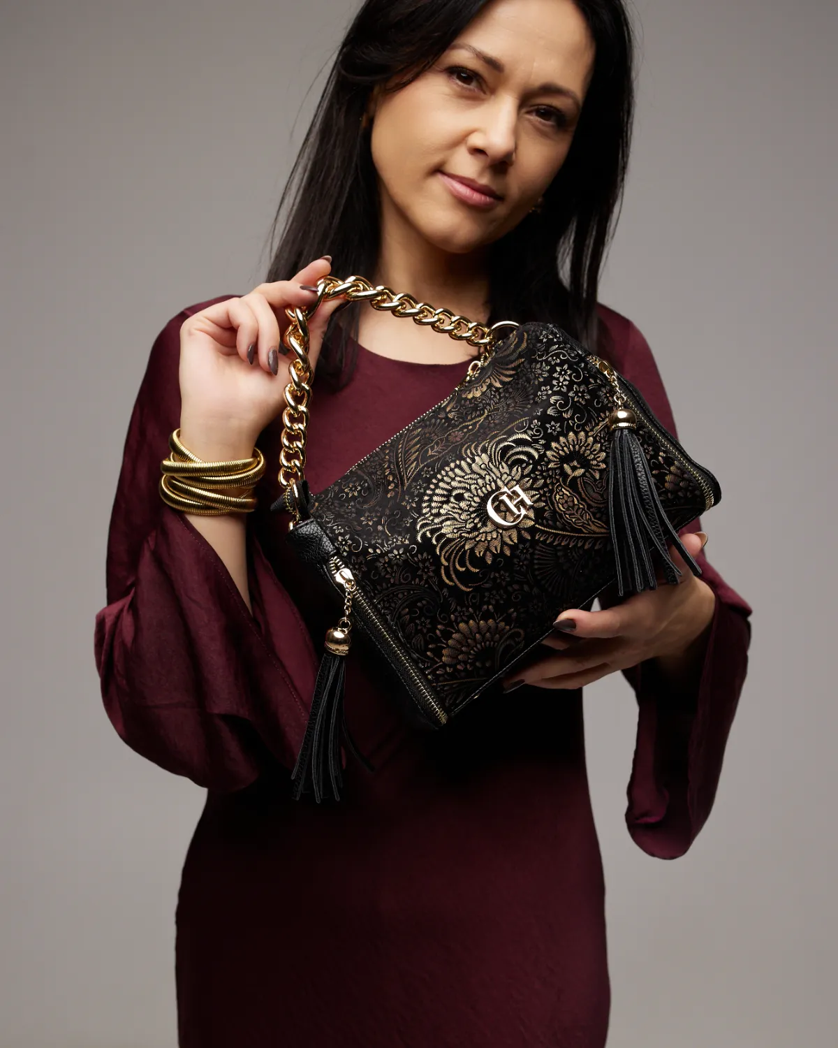 Pozwól sobie na odrobinę luksusu, który nie wymaga kompromisów. Model ZARINA został stworzony dla kobiety, która pragnie wyróżniać się z tłumu, ceniąc sobie zarówno wyrafinowany styl, jak i praktyczne rozwiązania. To więcej niż dodatek – to biżuteryjny akcent, który zamienia zwykły dzień w pasmo estetycznych uniesień. Głęboka czerń stanowiąca tło dla misternie wykonanego motywu złotych kwiatów sprawia, że ta torebka emanuje tajemniczością i prestiżem.